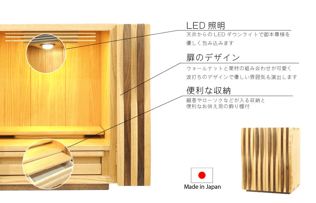 ウォールナットと栗材の組み合わせが珍しくても相性抜群。 2つの素材が寄り添い可愛らしくも優しい波打ちのデザインがおしゃれな雰囲気を演出します。 天井からのLEDライトを点けると優しい光が仏壇内部を照らし出しご本尊様、その周りの仏具も祈りの空間を演出します。 膳引き・引き出しも備わっておりますのでとても機能性の高いミニ仏壇です。