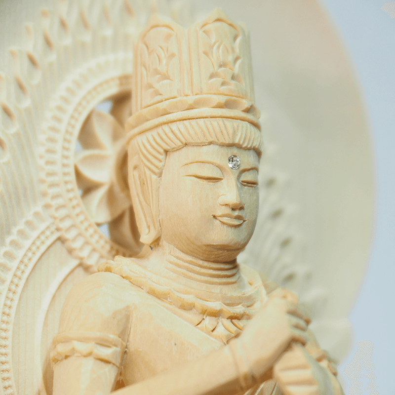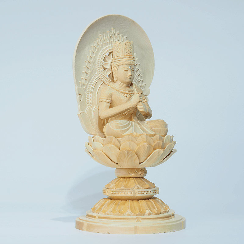 明るく清廉な色味が美しい「桧材」を素材に使用した仏像。仏像職人が心を込めて彫り上げた、穏やかなお顔が特徴です。台座は低めの丸台座なのでコンパクト仏壇向きです。永年お参り頂くうちに褐色になり重厚感が増していきます。