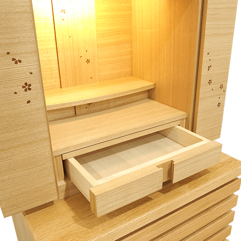 桜のかわいらしいデザインの国産仏壇に収納力抜群な台を組み合わせた2Wayスタイル。ライフスタイルに合わせ、上下別々にする事も可能。将来を見据えて選ばれる方に人気のモダン仏壇です。明るい色合いのスタイルは見る人、祈る人の心を浄化させ祈りの空間を創り出します。