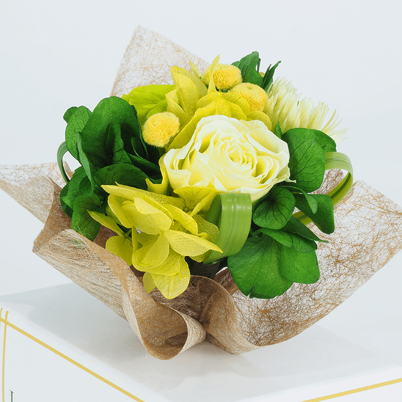 洋花を用いたブーケタイプのプリザーブドフラワーです。全てグリーンのグラデーションカラーで季節を問わず人気の色合いです。※花瓶は付属しておりません。