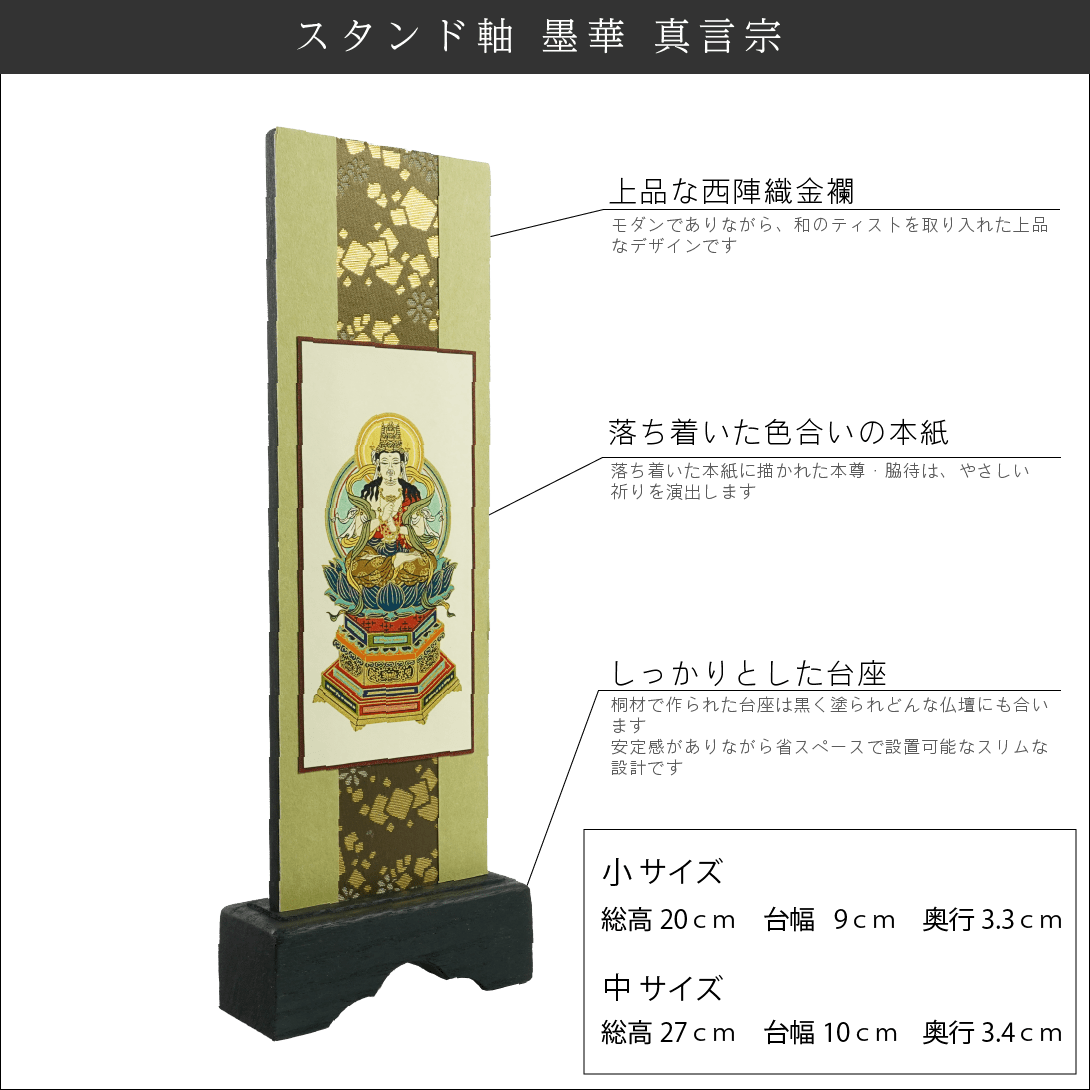 モダンでありながら和のティストを入れた上品なデザインは、どのようなお仏壇にも合う人気のスタンド軸。しっかりとした土台で安定感がありながら、省スペースで設置可能です。サイズは2種類からお選びいただけます。