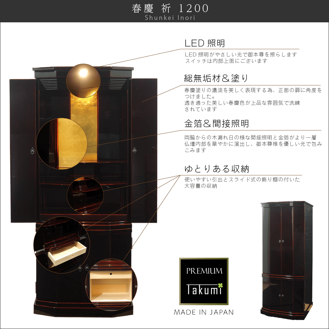 飛騨高山からは無垢材を使用し春慶塗りの技法を活かした多彩な色で製作したモダン仏壇をお届けします。