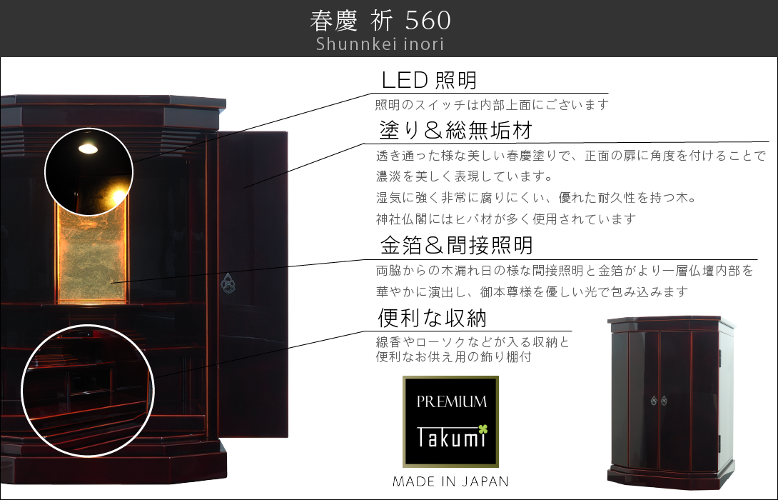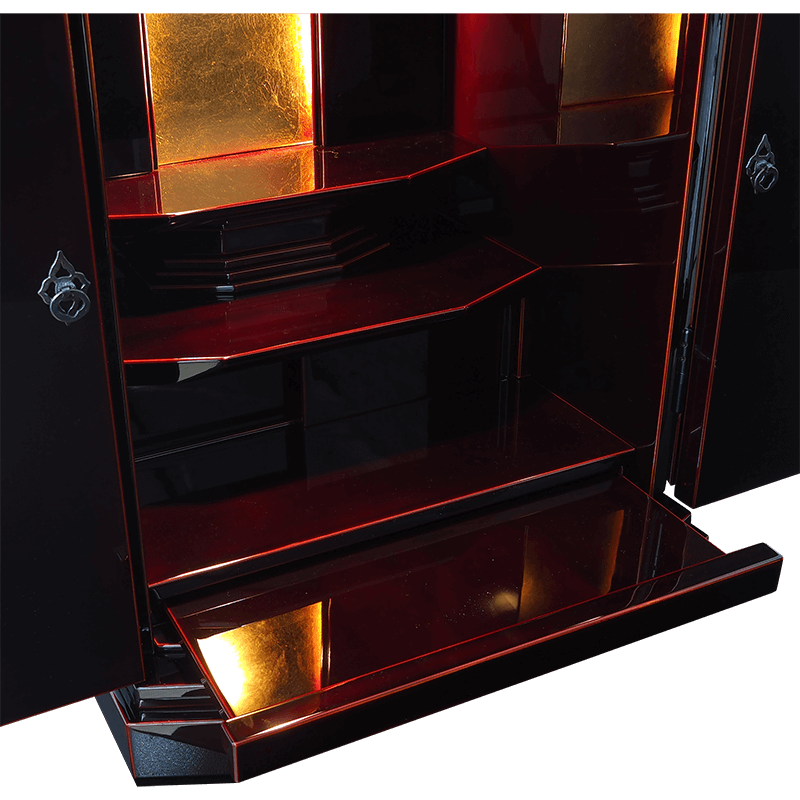 春慶塗の濃淡を美しく表現する為、正面の扉に角度を付けました。和室にも洋室にも合うモダンデザインと透き通った美しい春慶が上品な和モダン仏壇です。内部の珪藻土とLEDの間接照明が幻想的な空間を演出します。現代の家具調仏壇には出せない圧倒される雰囲気と洗練された匠の技が融合しており、お部屋にご安置して頂いたその日から心癒される空間に変わります。