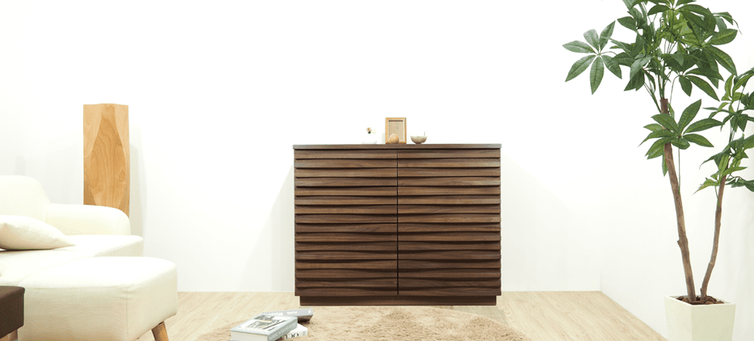 無垢材の前板に、職人の丁寧な仕上げにより波打つような立体的なルーバーを施した、重厚感と軽やかさを併せ持つ国産高級チェスト。自然な木目と現代的なデザインが融合しており、洗練されたインテリアに最適。