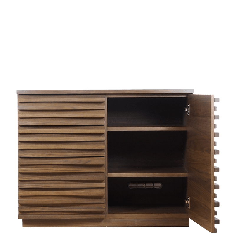無垢材の前板に、職人の丁寧な仕上げにより波打つような立体的なルーバーを施した、重厚感と軽やかさを併せ持つ国産高級チェスト。自然な木目と現代的なデザインが融合しており、洗練されたインテリアに最適。