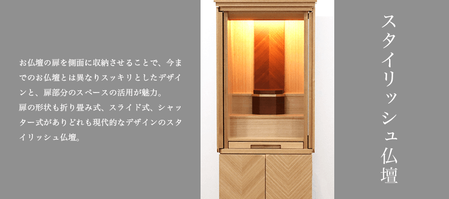 押し込み式の扉は場所をとらずスタイリッシュな佇まい。シンプルながら木目を矢のように合わせたデザインは扉を閉めても美しく、リビングに馴染む都市型仏壇です。