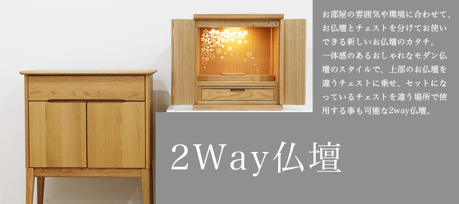 扉が格納式ですっきりとしたモダンなデザインが人気で内部はガラスを用い遺品なども収めることもできる日本製仏壇と収納力抜群なチェストを組み合わせた2Wayスタイル。ライフスタイルに合わせ、上下別々にする事も可能な為、将来を見据えて機能性とデザインを両立した2Wayデザイナーズ仏壇です。