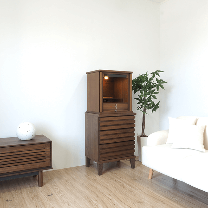 扉が格納式ですっきりとしたモダンなデザインが人気で内部はガラスを用い遺品なども収めることもできる日本製仏壇と収納力抜群なチェストを組み合わせた2Wayスタイル。ライフスタイルに合わせ、上下別々にする事も可能な為、将来を見据えて機能性とデザインを両立した2Wayデザイナーズ仏壇です。