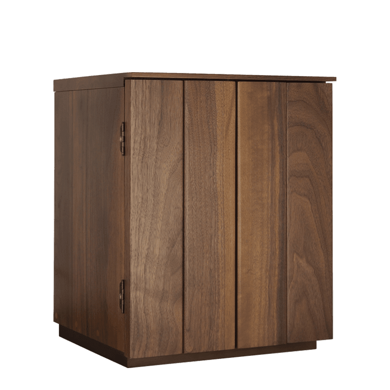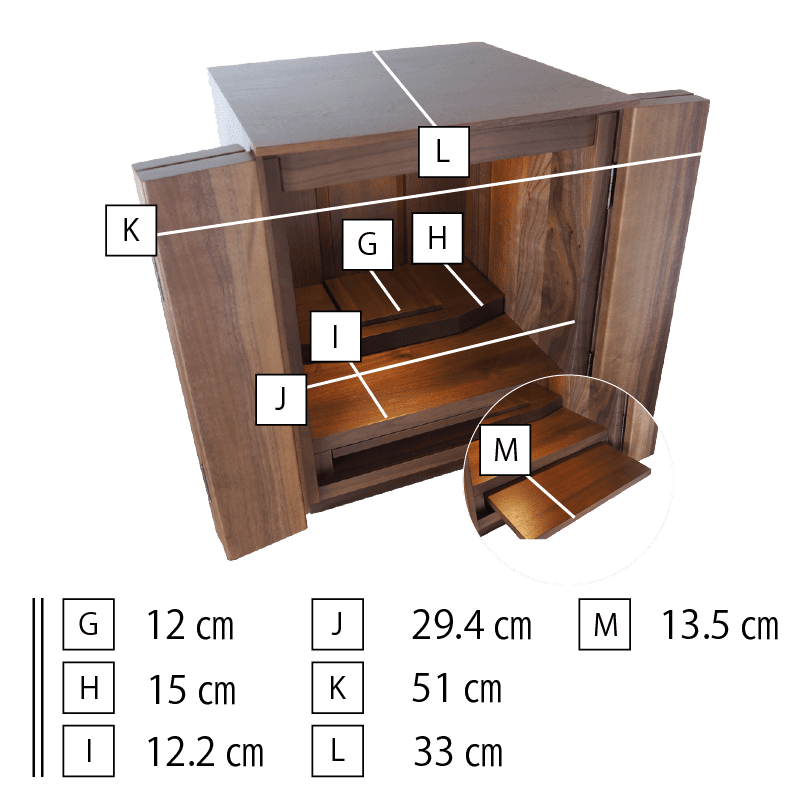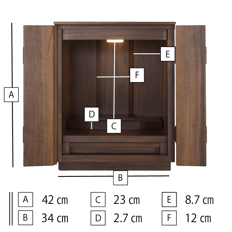ウォールナットの無垢材をふんだんに使用した贅沢なお仏壇。小さいサイズながら質にはこだわり、デザインもシンプルにまとめています。濃いめのチェストなどに合わせるとすんなり馴染みます。天井にはLEDライトも備わっていますのでご本尊様を優しく照らし出し、あたたかな雰囲気を演出します。