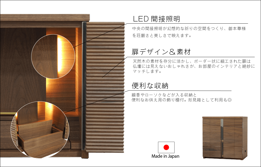 作り手のこだわりと丁寧なモノづくりの成果が随所にみられ、職人の魂を感じさせる逸品。天然木の素材を存分に活かし細部までこだわった明るくおしゃれな優しさあふれるお仏壇。背中にはLED間接照明も施されており、より優雅に祈りの空間を演出します。