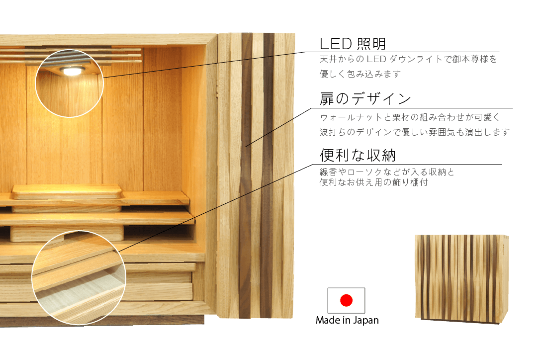 ウォールナットと栗材の組み合わせが珍しくても相性抜群。 2つの素材が寄り添い可愛らしくも優しい波打ちのデザインがおしゃれな雰囲気を演出します。 天井からのLEDライトを点けると優しい光が仏壇内部を照らし出しご本尊様、その周りの仏具も祈りの空間を演出します。 膳引き・引き出しも備わっておりますのでとても機能性の高いミニ仏壇です。
