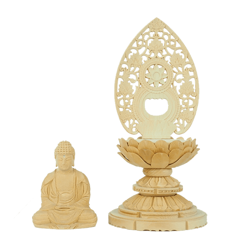明るく清廉な色味が美しい「桧材」を素材に使用した仏像。仏像職人が心を込めて彫り上げた、穏やかなお顔が特徴です。台座は低めの丸台座なのでコンパクト仏壇向きです。永年お参り頂くうちに褐色になり重厚感が増していきます。