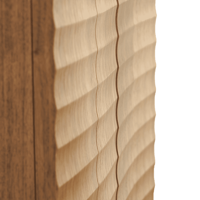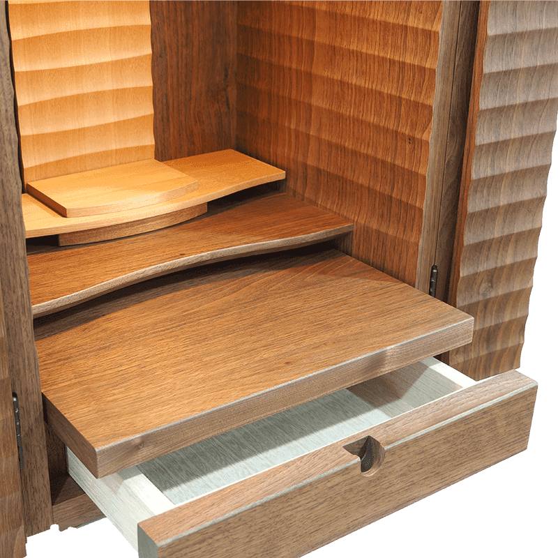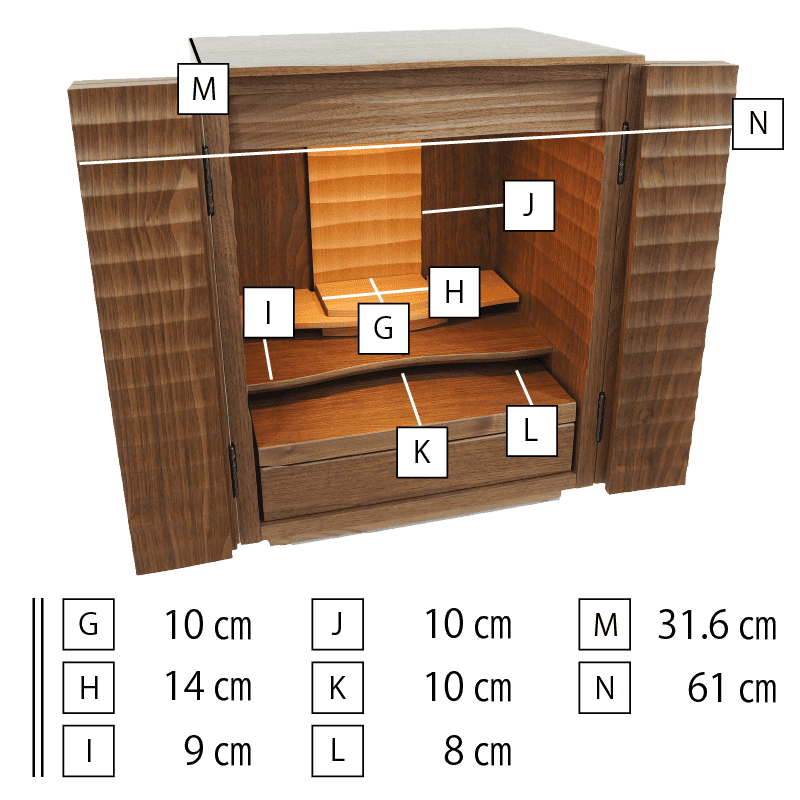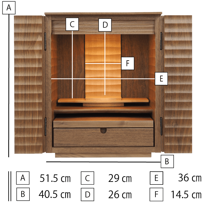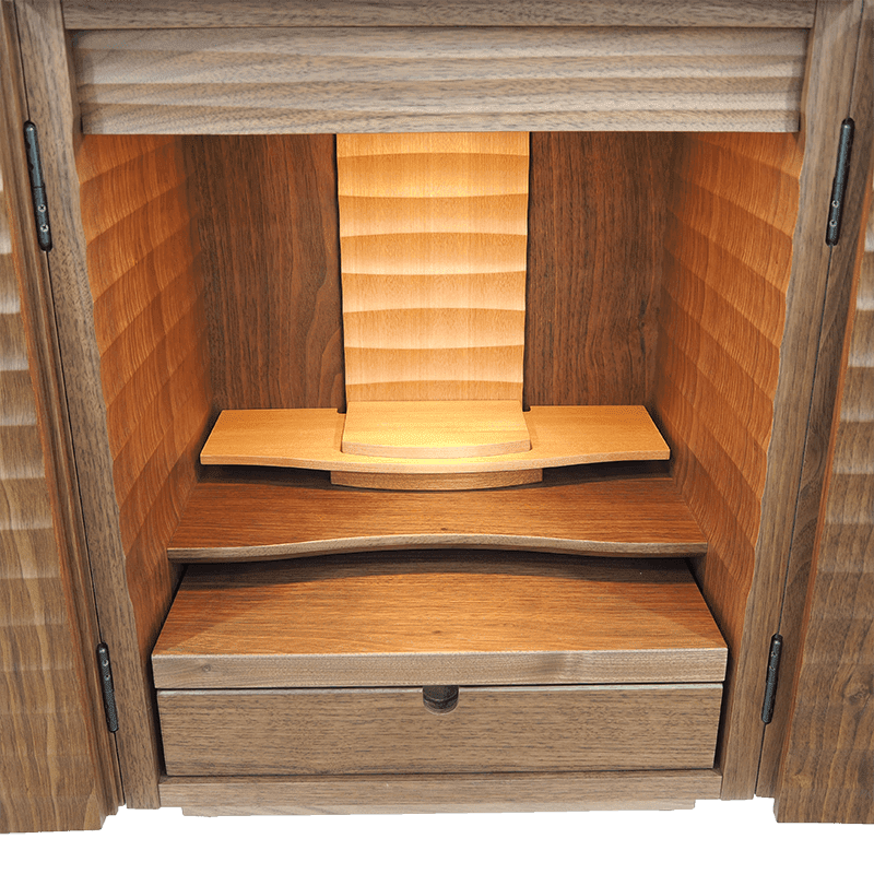 水面が揺れるような軽やかなカーブを描いたデザインで、木のぬくもりを感じるコンパクト仏壇です。 高級材のアメリカンウォールナットの質感と美しいラインが融合し見る人を魅了する逸品。 大きな御本尊・御位牌もお祀りできるよう内部の棚板が取り外し可能になっており、飾り棚は仏具を設置したまま前へスライドできる為お給仕がしやすく機能面でも優れている安心の日本製仏壇です。木のぬくもりを感じながら高級感のあるお仏壇をお探しの方におすすめです。