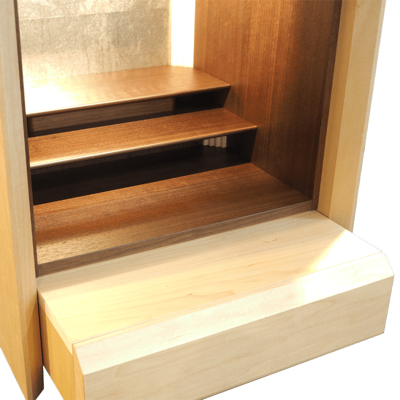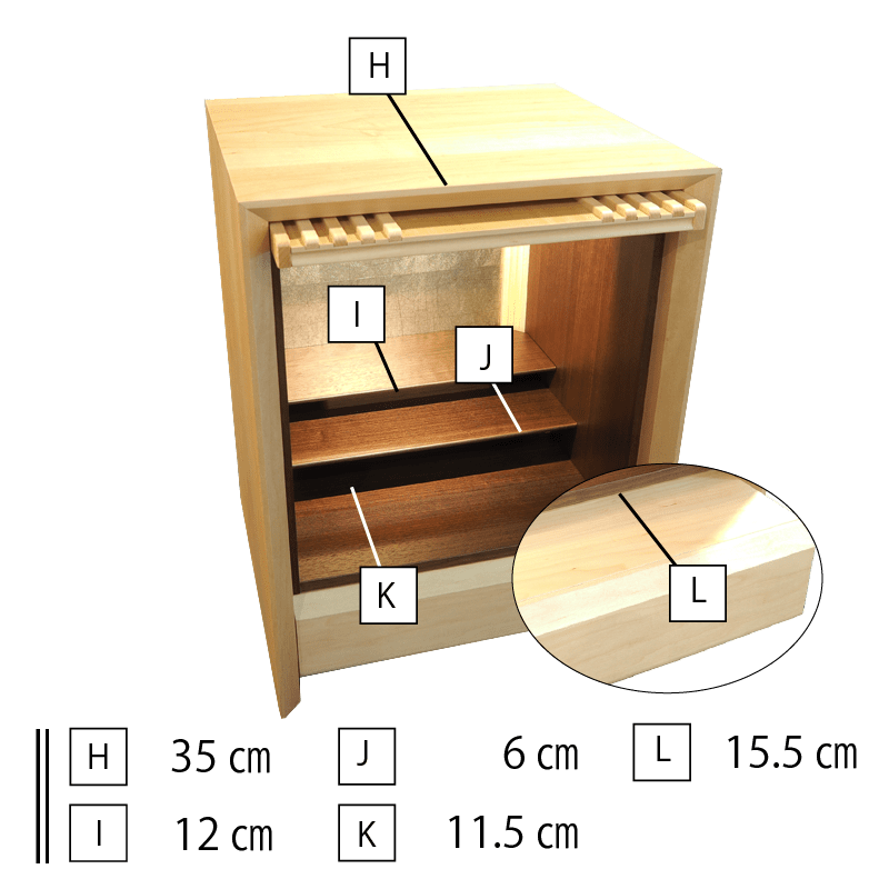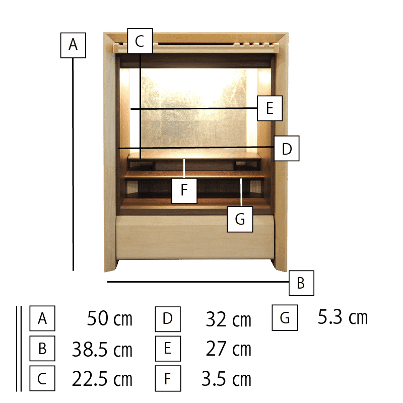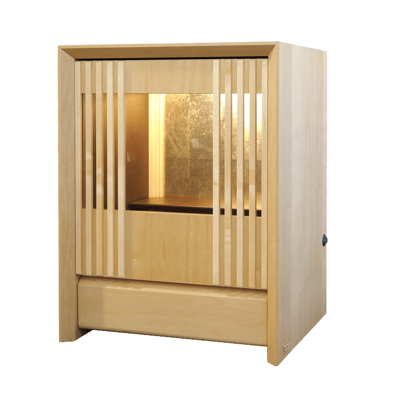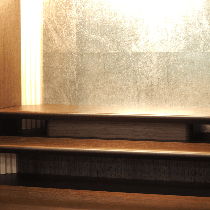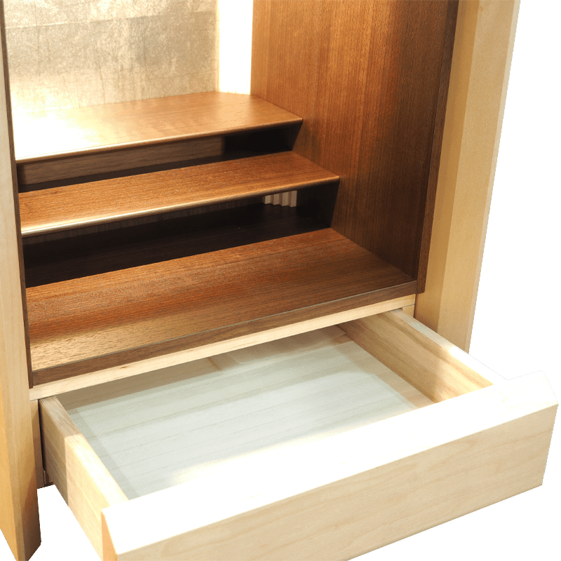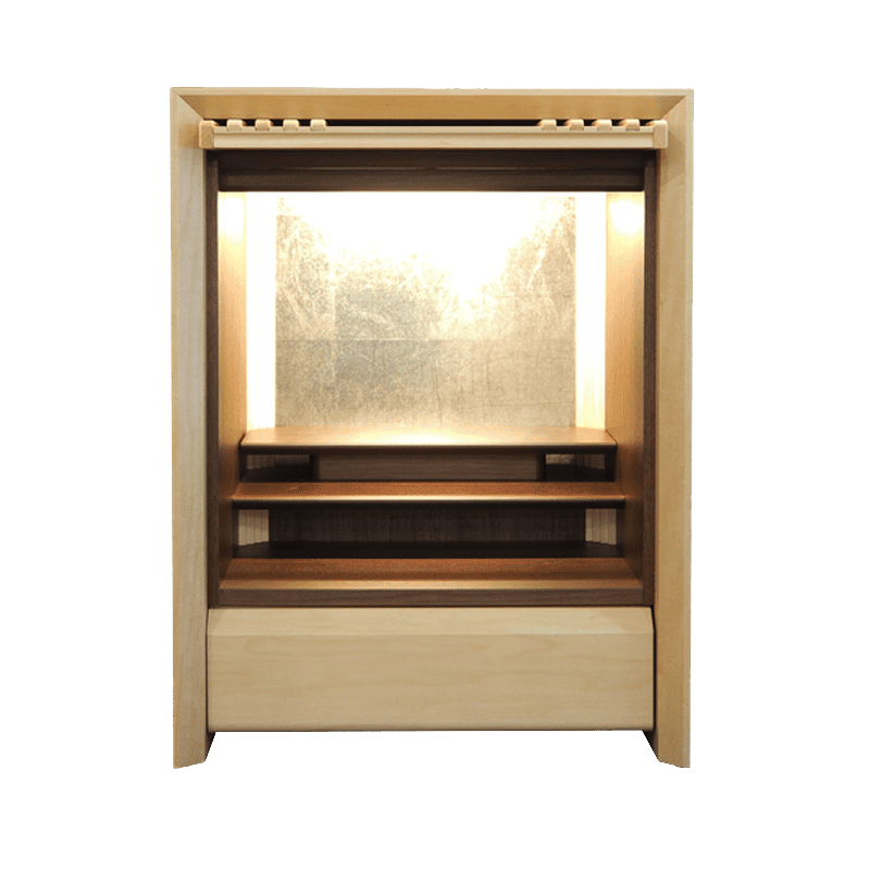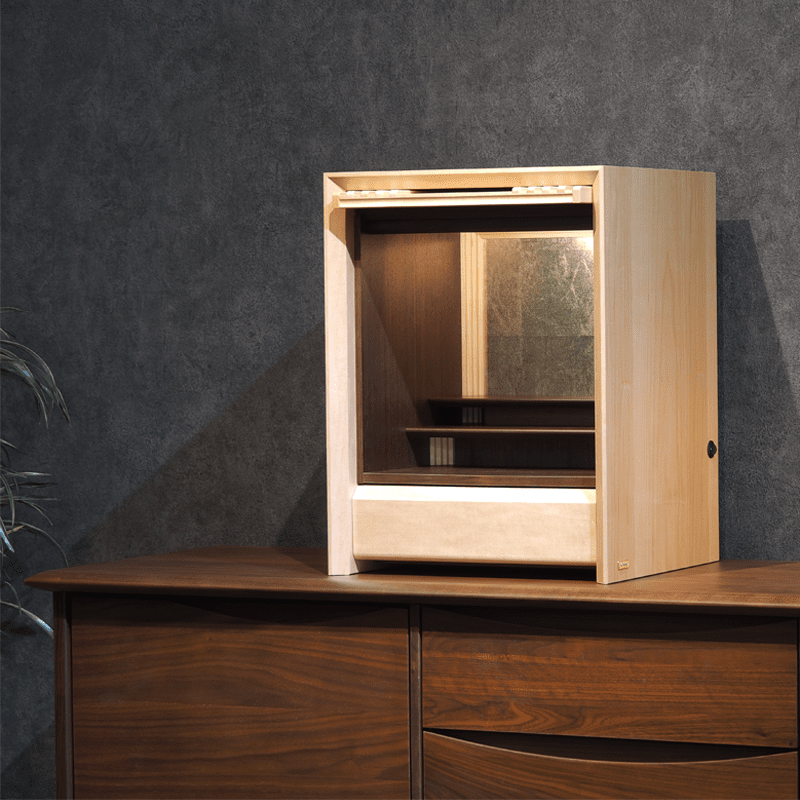 ガラスとメープル材でデザインされた跳ね上げ式の扉が斬新で扉を閉めた状態でもお祀りが可能。おしゃれな背面のデザインと間接照明の融合で、幻想的な祈りの空間を創り出し内部をより洗練された雰囲気に魅せます。お供え用のスライド式飾り棚や線香やロウソクを収納できる引き出しも備わっています。