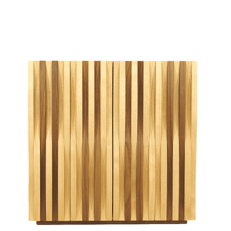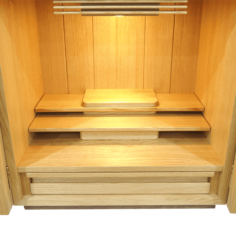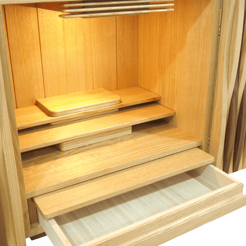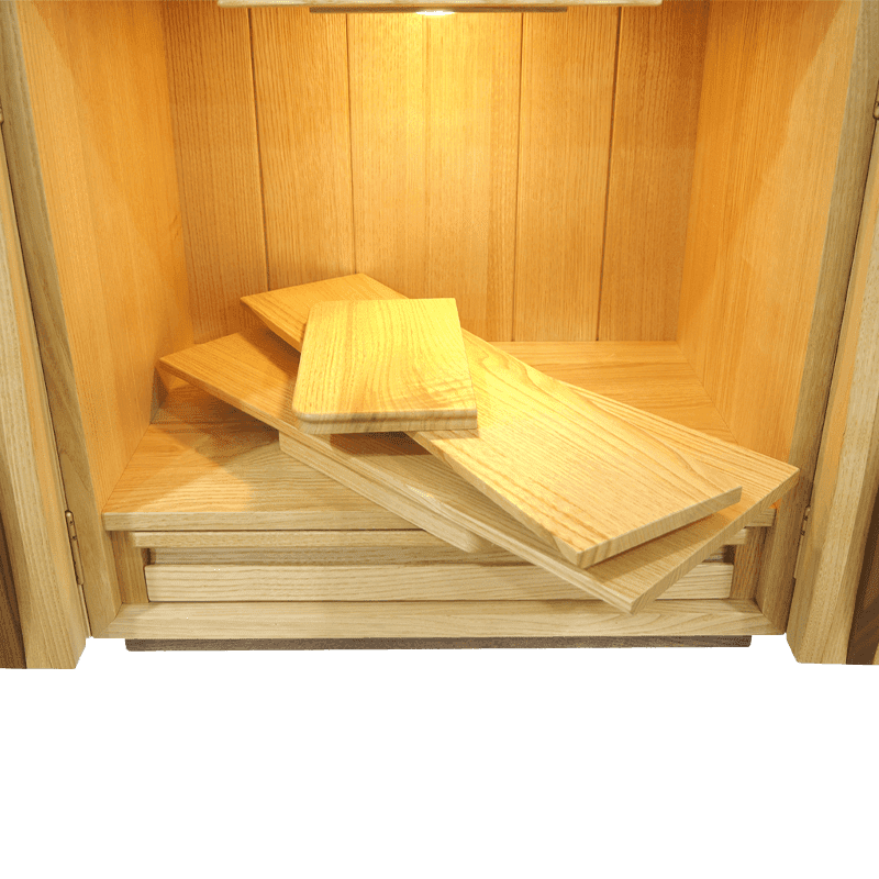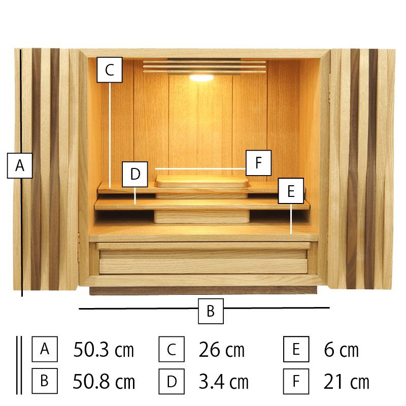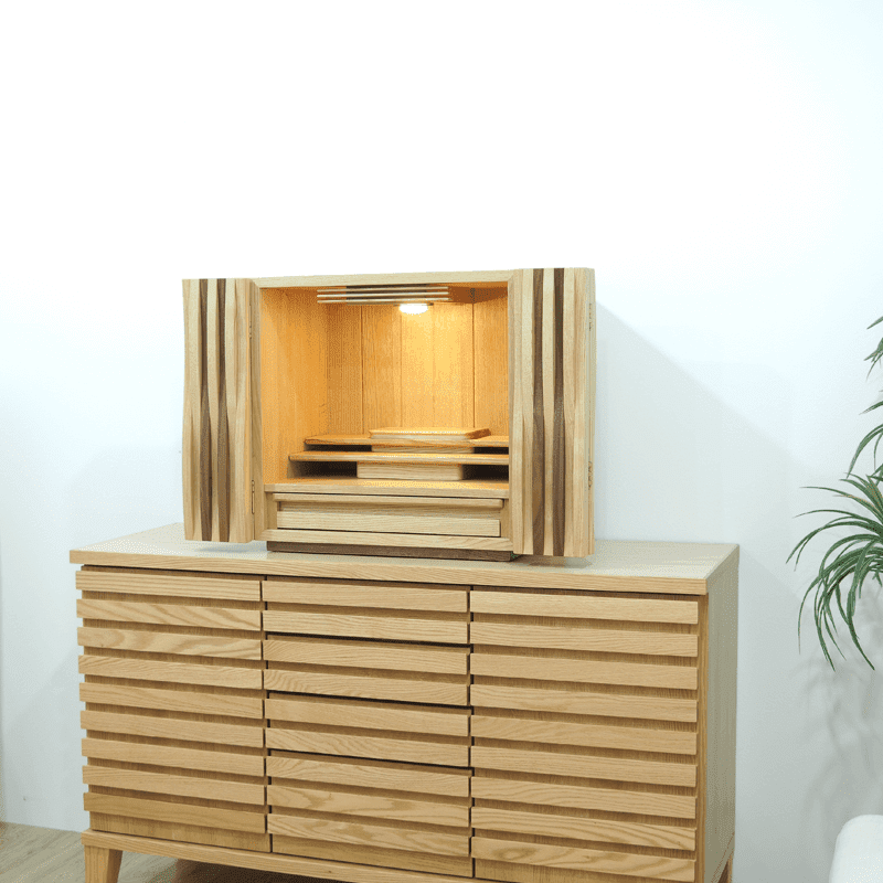 ウォールナットと栗材の組み合わせが珍しく、相性抜群。2つの素材が寄り添い可愛らしくも優しい波打ちのデザインがおしゃれな雰囲気を演出します。天井からのLEDライトを点けると優しい光が仏壇内部を照らし出し、ご本尊様、その周りの仏具も祈りの空間を演出します。 膳引き・引き出しも備わっていますのでとても機能性も高いミニ仏壇です。
