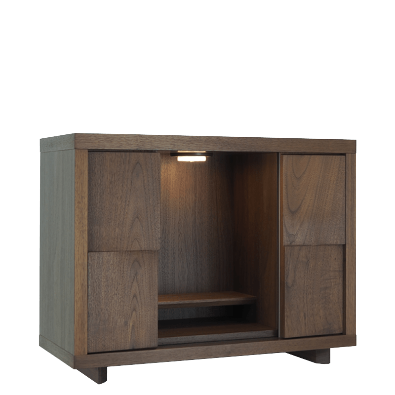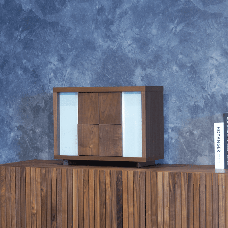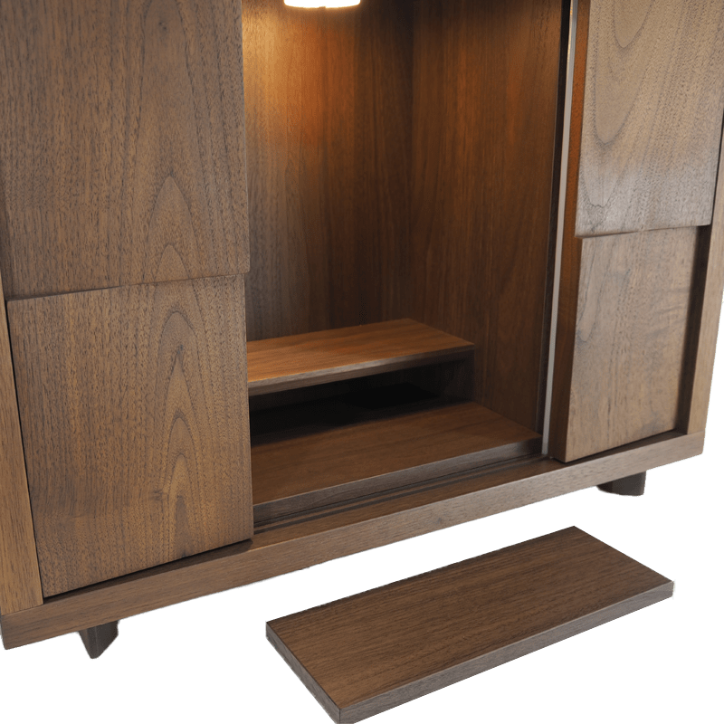 ライフスタイルや、様々な用途に合わせてお祀りができるコンパクト仏壇。あたたかい印象のウォールナットの扉とスタイリッシュな印象を醸し出すガラスの扉を使用。使い方は十人十色で現代の祈りの空間に絶妙にマッチします。