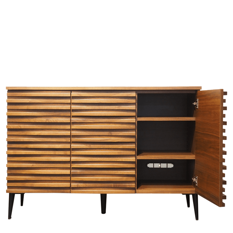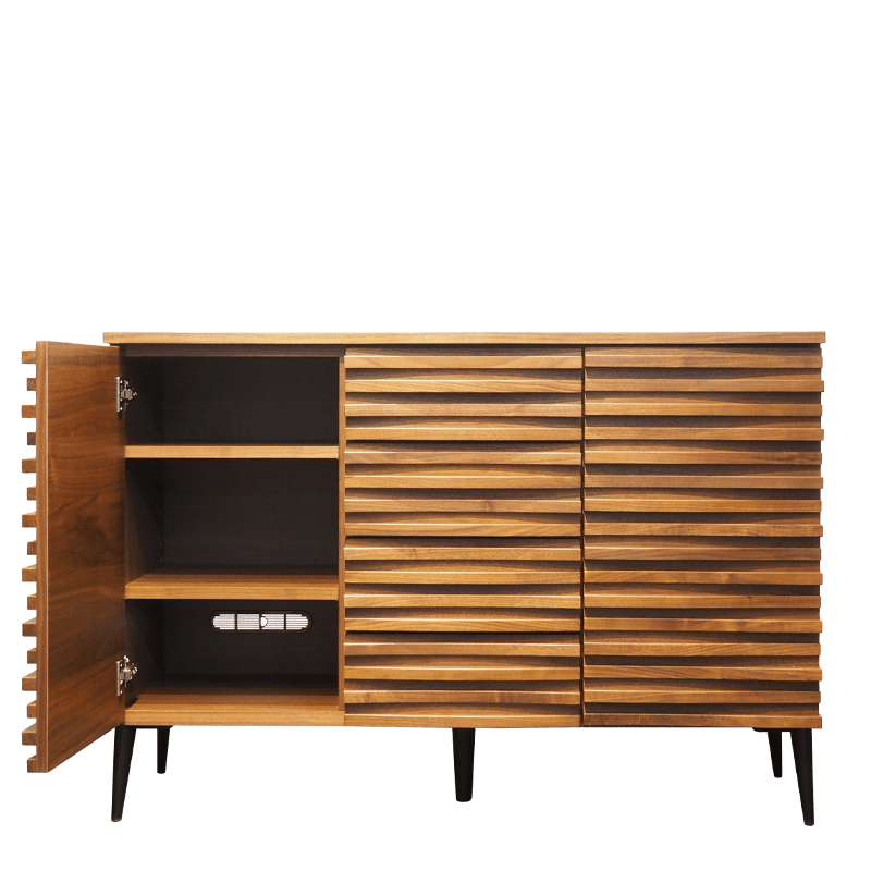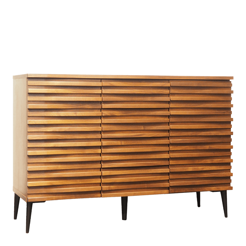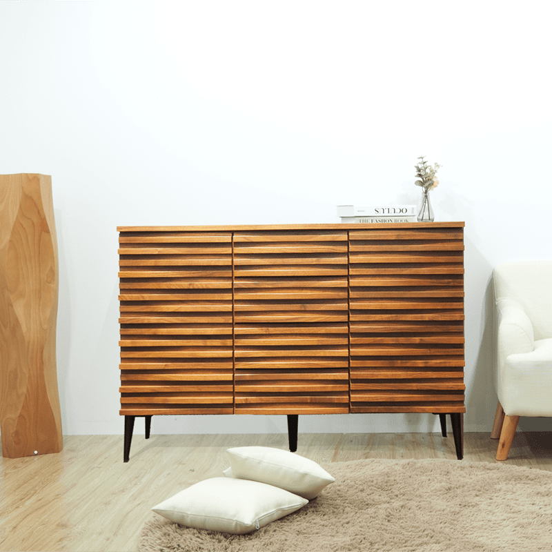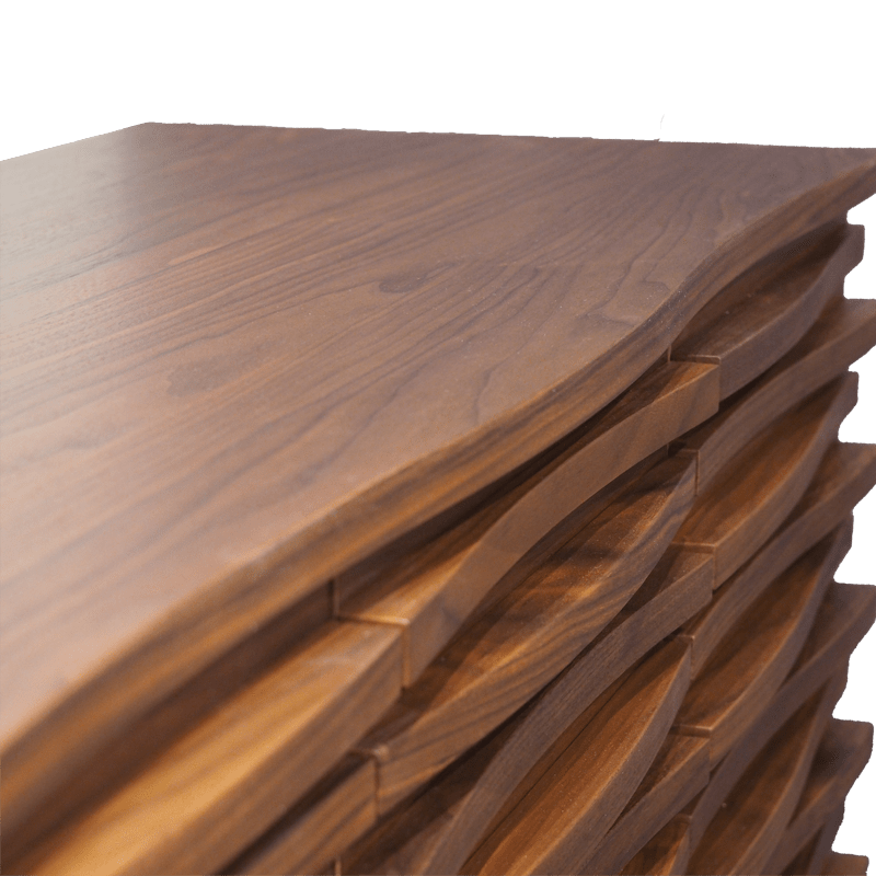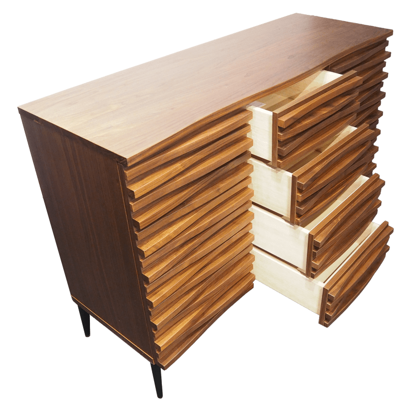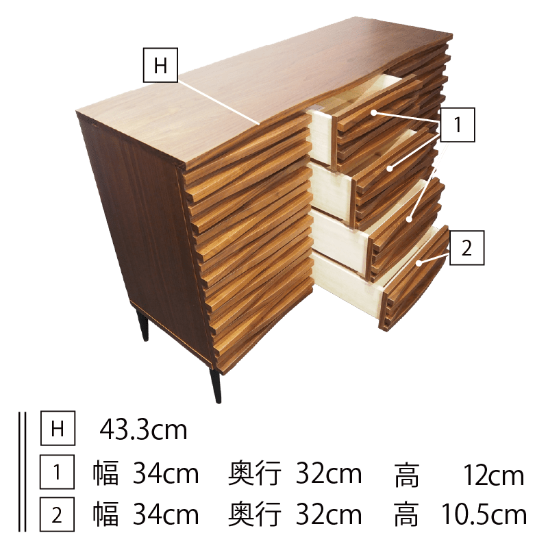 無垢材の前板に、職人の丁寧な仕上げにより波打つような立体的なルーバーを施した、重厚感と軽やかさを併せ持つ国産高級チェスト。自然な木目と現代的なデザインが融合しており、洗練されたインテリアに最適。2列4段の引き出しも備わっており、収納力も高く、脚付きで掃除もしやすいのが特徴。