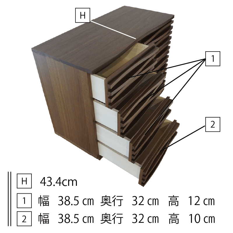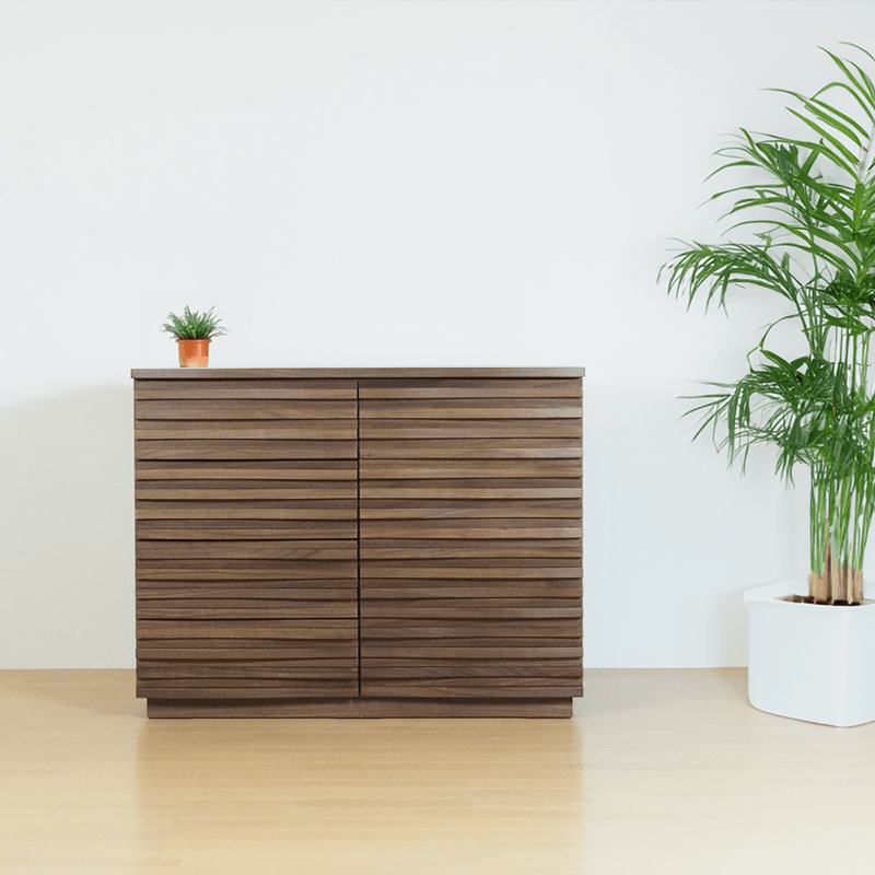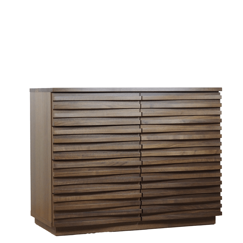 無垢材の前板に、職人の丁寧な仕上げにより波打つような立体的なルーバーを施した、重厚感と軽やかさを併せ持つ国産高級チェスト。自然な木目と現代的なデザインが融合しており、洗練されたインテリアに最適。