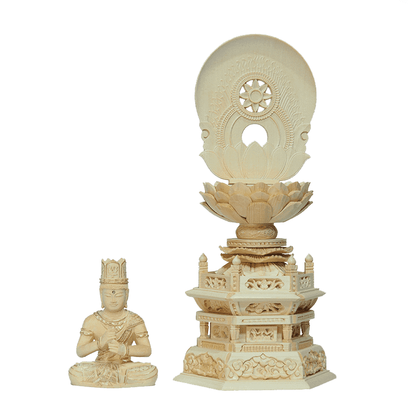 ひのき材を使用して手彫りで彫られ、木目が均一で美しい仕上りの仏像です。永年お参り頂くうちに褐色になり重厚感が増していきます。台座の形状は重厚感のある六角台座で、とても細かい仕上りになっております。