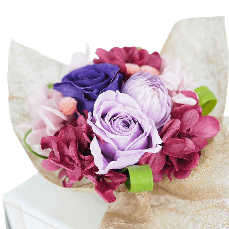 洋花を用いたブーケタイプのプリザーブドフラワーです。同じ紫の中でも色の違いが楽しめる上品なカラーが人気です。※花瓶は付属しておりません。