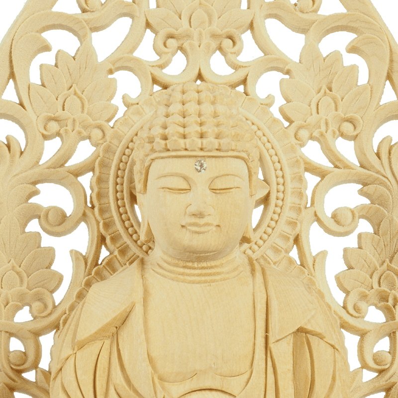 明るく清廉な色味が美しい「桧材」を素材に使用した仏像。仏像職人が心を込めて彫り上げた、穏やかなお顔が特徴です。台座は低めの丸台座なのでコンパクト仏壇向きです。永年お参り頂くうちに褐色になり重厚感が増していきます。