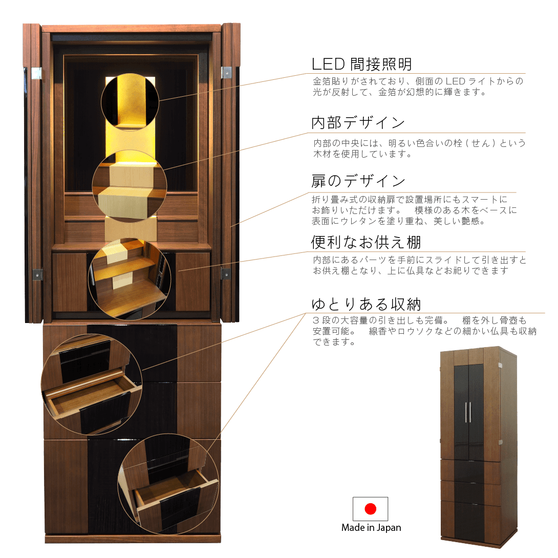 現代の生活空間に合うモダンなデザインの中に荘厳さを感じられ、ご本尊の背面の光が幻想的な空間を演出します。椅子を使用してお参り可能な高さ135cmタイプです。