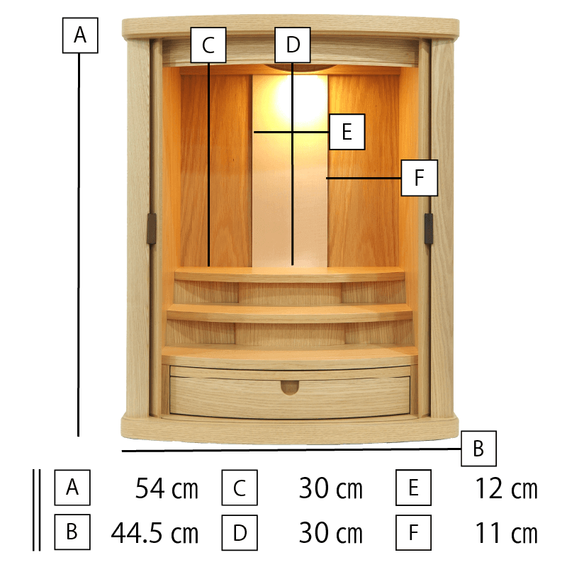 台幅44cmでスマートな設計ながら、扉は巻戸式で本体内側の両サイドに収まり、横に広げないので一般的なお仏壇のように、扉を開いた際の余分な空間ができることがありません。