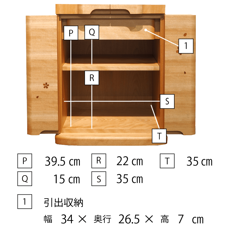 明るい色と木目が美しいシックなお仏壇の扉には、桜のデザインが施されております。