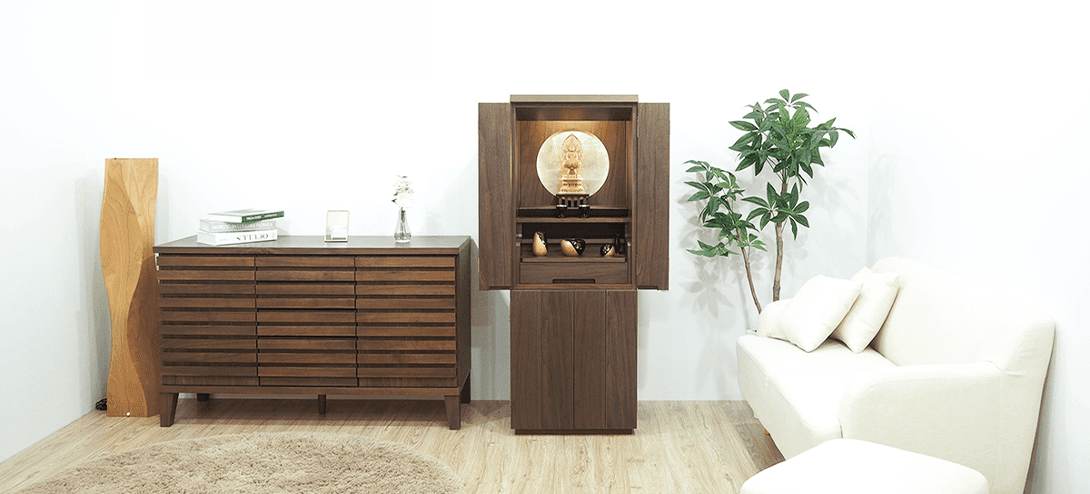 モダンなウォールナットの質感と、御本尊様を際立てる後板照明。収納ができ、経机としても使用できる専用の椅子付き。