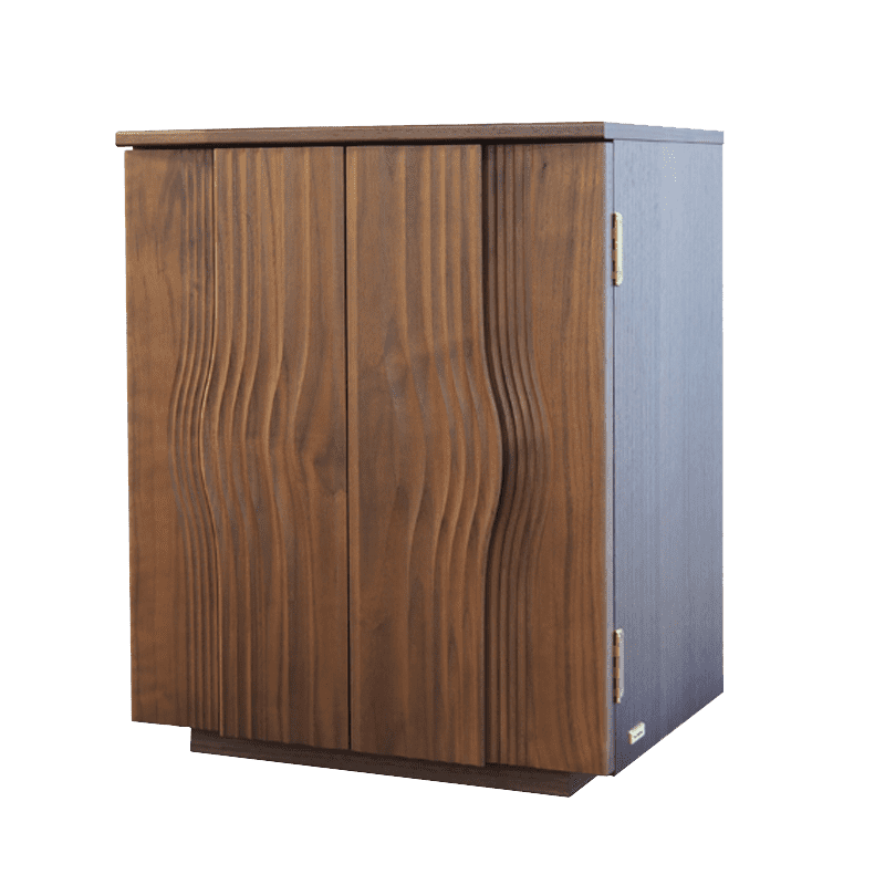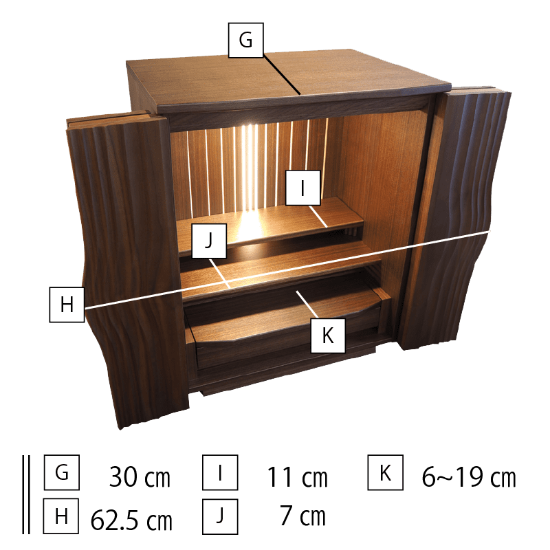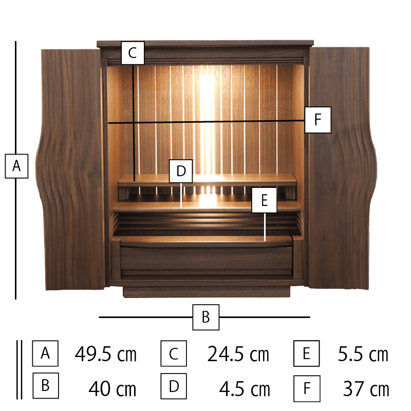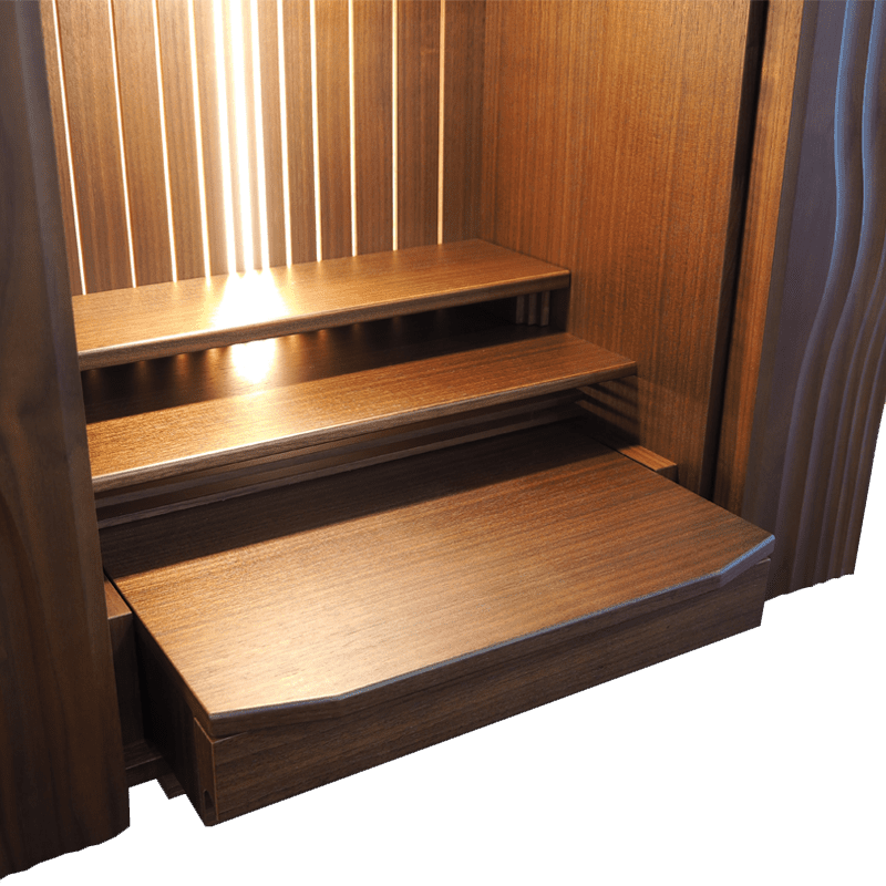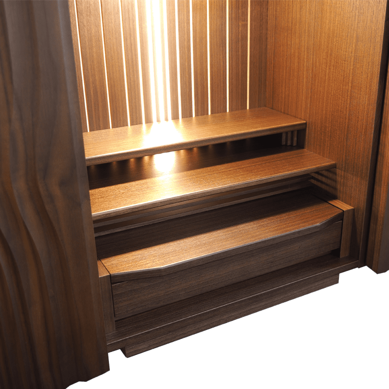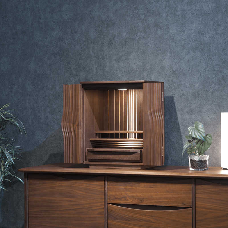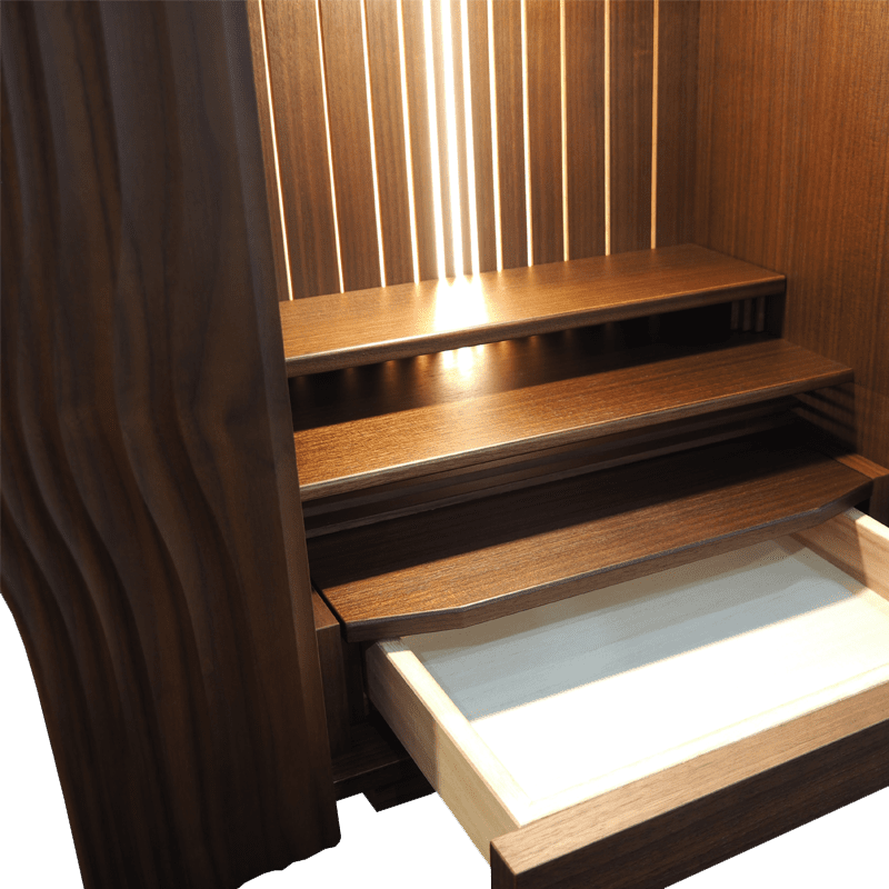 ウォールナットの無垢材を使用したデザインされた扉が見る人を引きつけ、温かみと高級感を醸し出しています。背面には中央に向かっていくLEDライトのストライプが内部のおしゃれな空間を演出し、手を合わせる人々の心の拠り所を演出します。線香やロウソクなどを収納できる引き出しも備わっており機能性ももちあわせています。