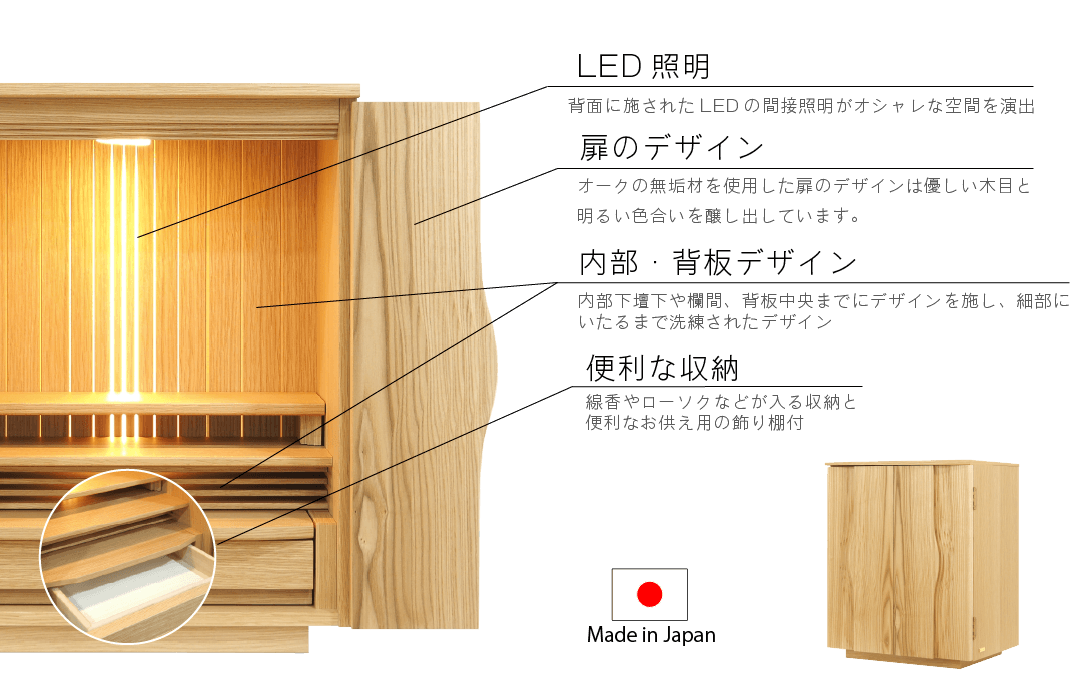 オークの無垢材を使用した扉のデザインは優しい質感と明るい色合いで、歪だがおしゃれ。背面には中央に寄せるLEDのあたたかな光が祈りの空間へと導きます。 内部下段下のや欄間のデザインなど細かい部分にも手をかけ洗練されたイメージで仕上げています。 小物入れの引き出しやスライド式の膳引きなども備わっております。