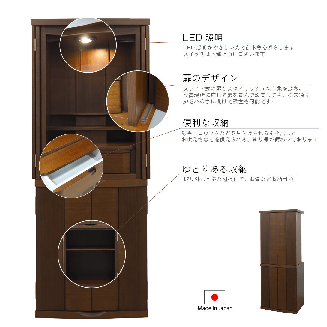 ウォールナットの質感がお部屋を暖かく包み込み、家具にさりげなく調和します。スタイリッシュなスライド扉を採用しているため、設置場所に応じて扉を畳んでスマートに設置したり、従来のお仏壇のように扉を開けて設置することもでき、印象を変えて設置ができるお仏壇。仏具などを収納できる引き出しや、お供え物を備えられるスライド式の棚板もあるのが嬉しい。