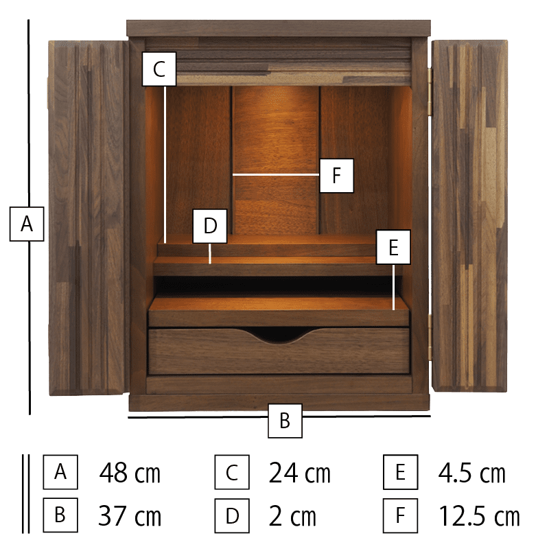 めずらしい組木細工のおしゃれなミニ仏壇で、ウォールナット色のインテリアや明るめのインテリアにも両方溶け込みます。天井にはLEDライトも備わっておりますので、ご本尊様を優しい光で包み込み、仏壇内部をあたたかな祈りの空間を演出します。引き出しやお供え物を飾るスライド式の棚も備わっておりますのでお参りの際に便利です。
