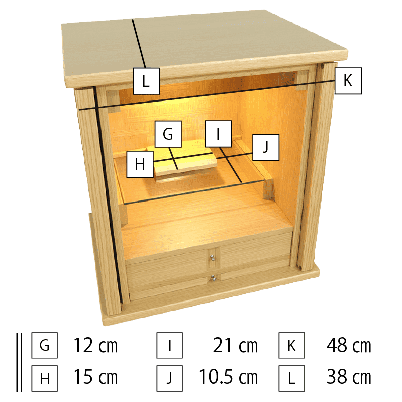 正面に煉瓦を積み上げたようなおしゃれなデザインに、内部のガラス棚は故人様の思い出の品なども収めることもできるこだわりの詰まったモダンな日本製仏壇です。扉は押し込み式のスライドドアでデッドスペースが無くスマートに設置できます。オークならではの明るく優しい色合いはお部屋の家具ともマッチします。