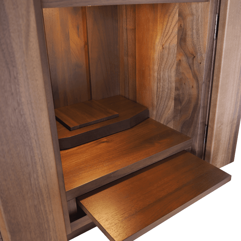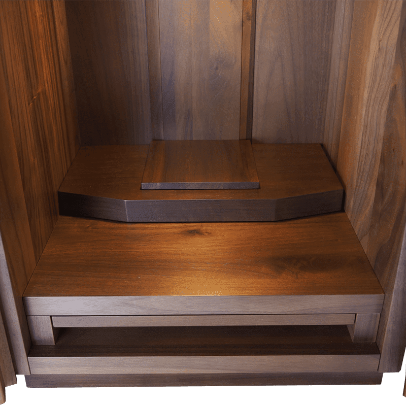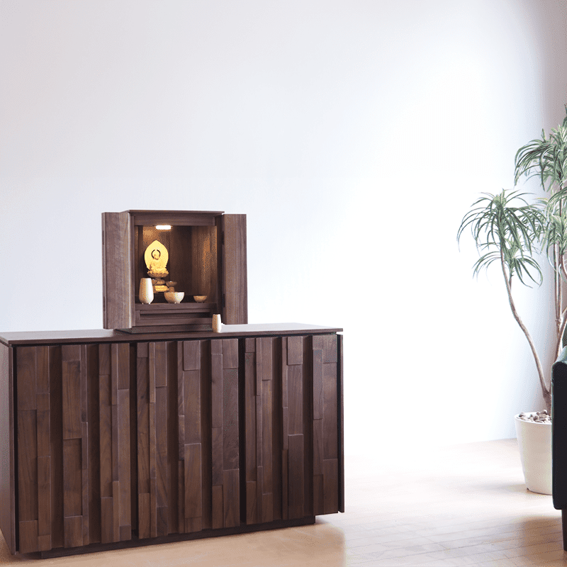 ウォールナットの無垢材をふんだんに使用した贅沢なお仏壇。小さいサイズながら質にはこだわり、デザインもシンプルにまとめています。濃いめのチェストなどに合わせるとすんなり馴染みます。天井にはLEDライトも備わっていますのでご本尊様を優しく照らし出し、あたたかな雰囲気を演出します。