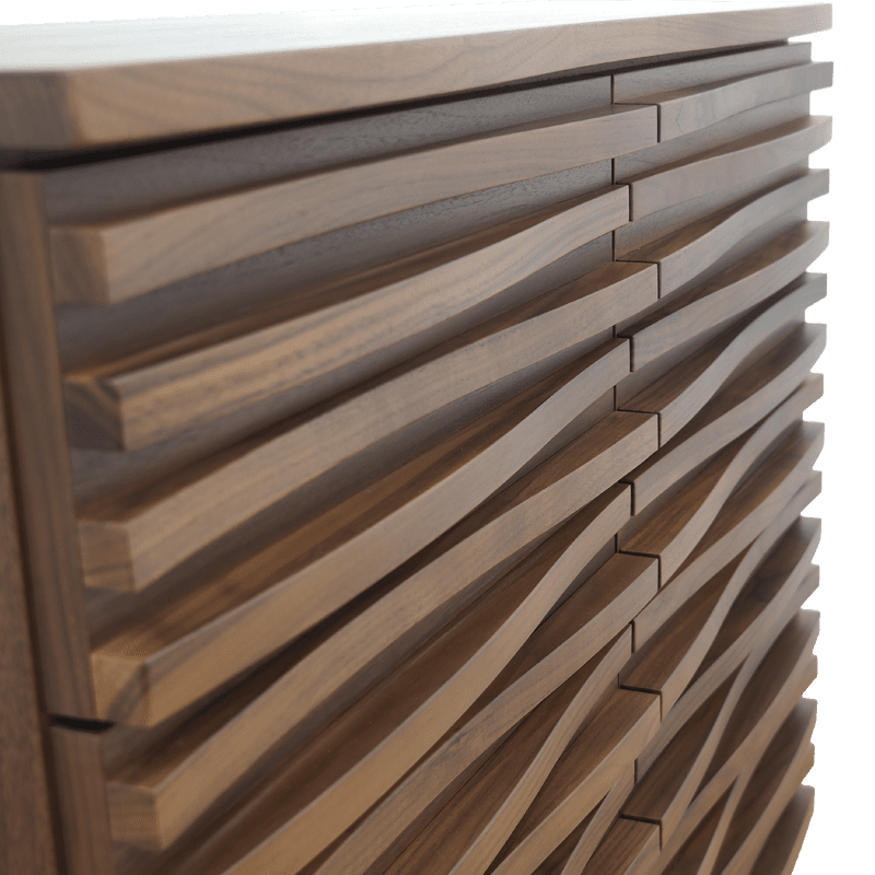 優美な曲線の連なりによって形成された表情は、大河の水面や大木の樹皮など雄大な自然を連想させてくれます。個性的で唯一無二のデザインです。リビングルームはもちろん、寝室などでも。