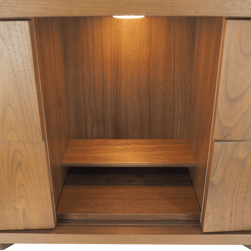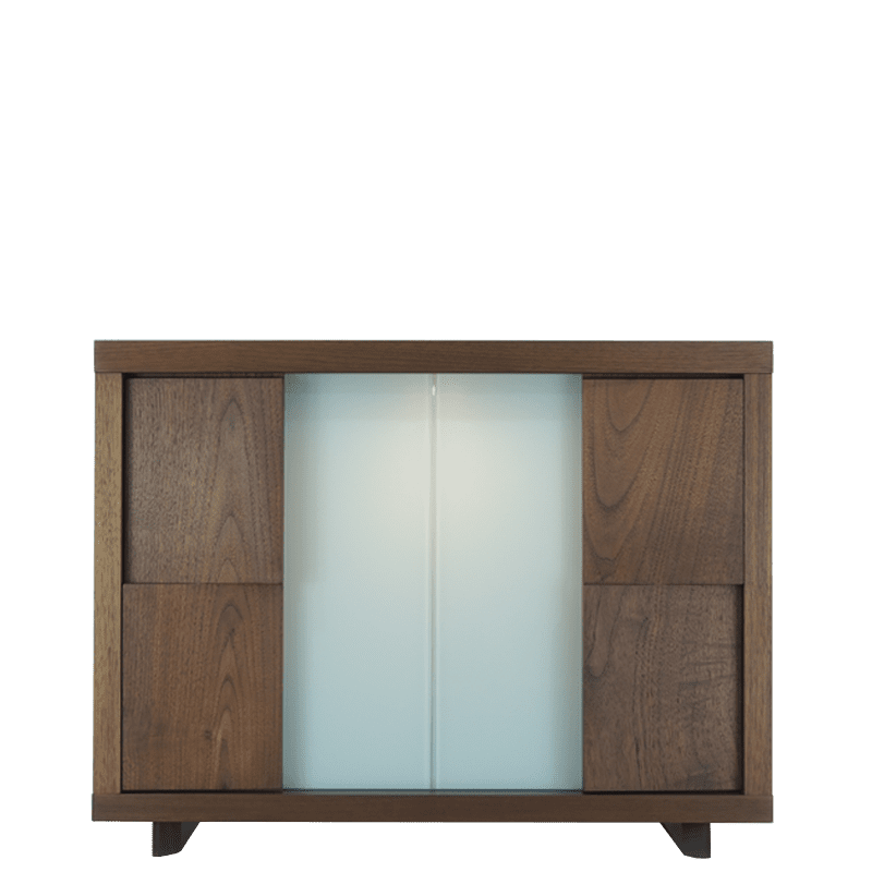 ライフスタイルや、様々な用途に合わせてお祀りができるコンパクト仏壇。あたたかい印象のウォールナットの扉とスタイリッシュな印象を醸し出すガラスの扉を使用。使い方は十人十色で現代の祈りの空間に絶妙にマッチします。