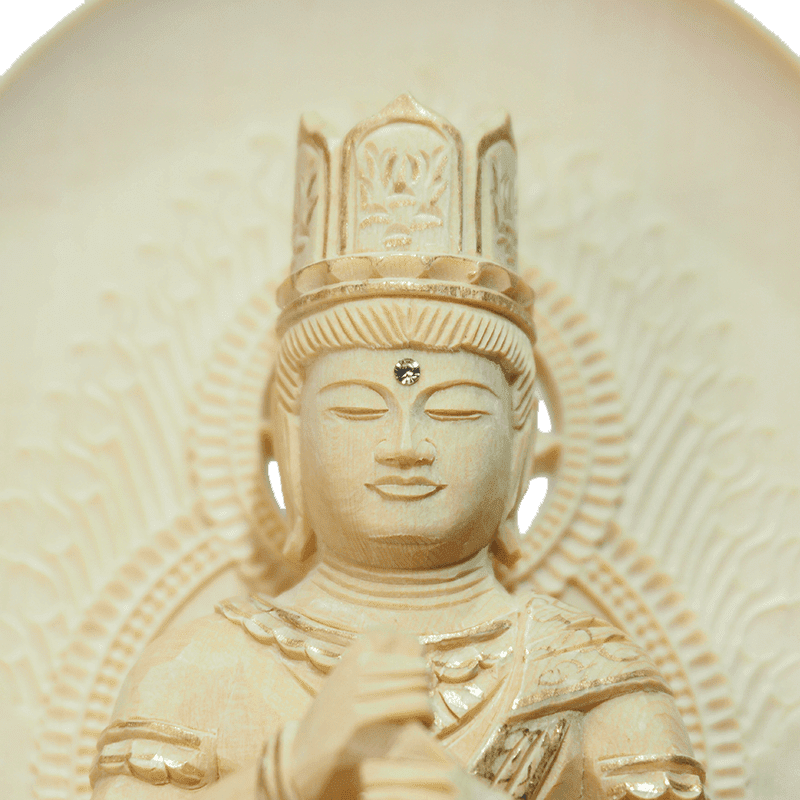 ひのき材を使用して手彫りで彫られ、木目が均一で美しい仕上りの仏像です。永年お参り頂くうちに褐色になり重厚感が増していきます。台座の形状は重厚感のある六角台座で、とても細かい仕上りになっております。